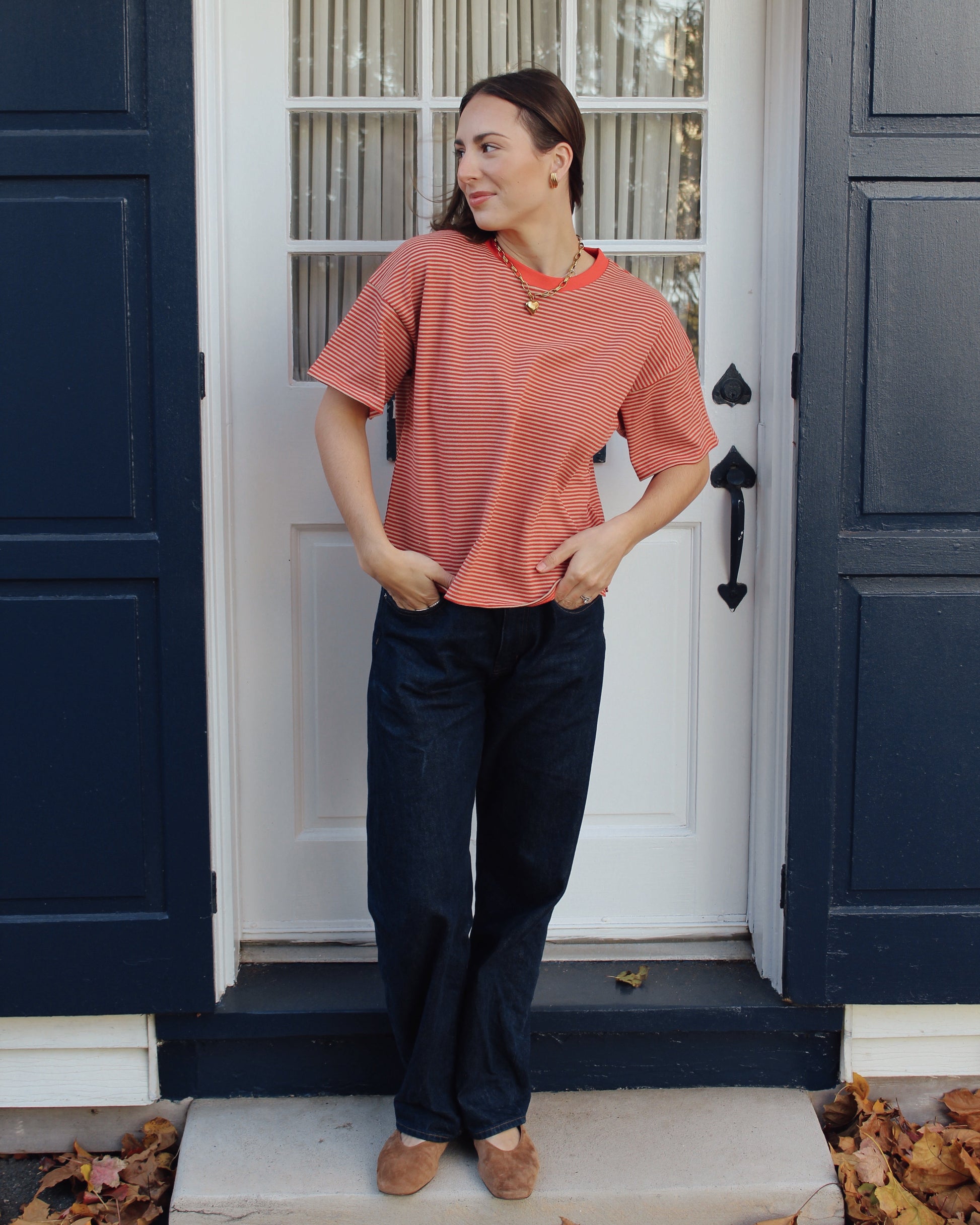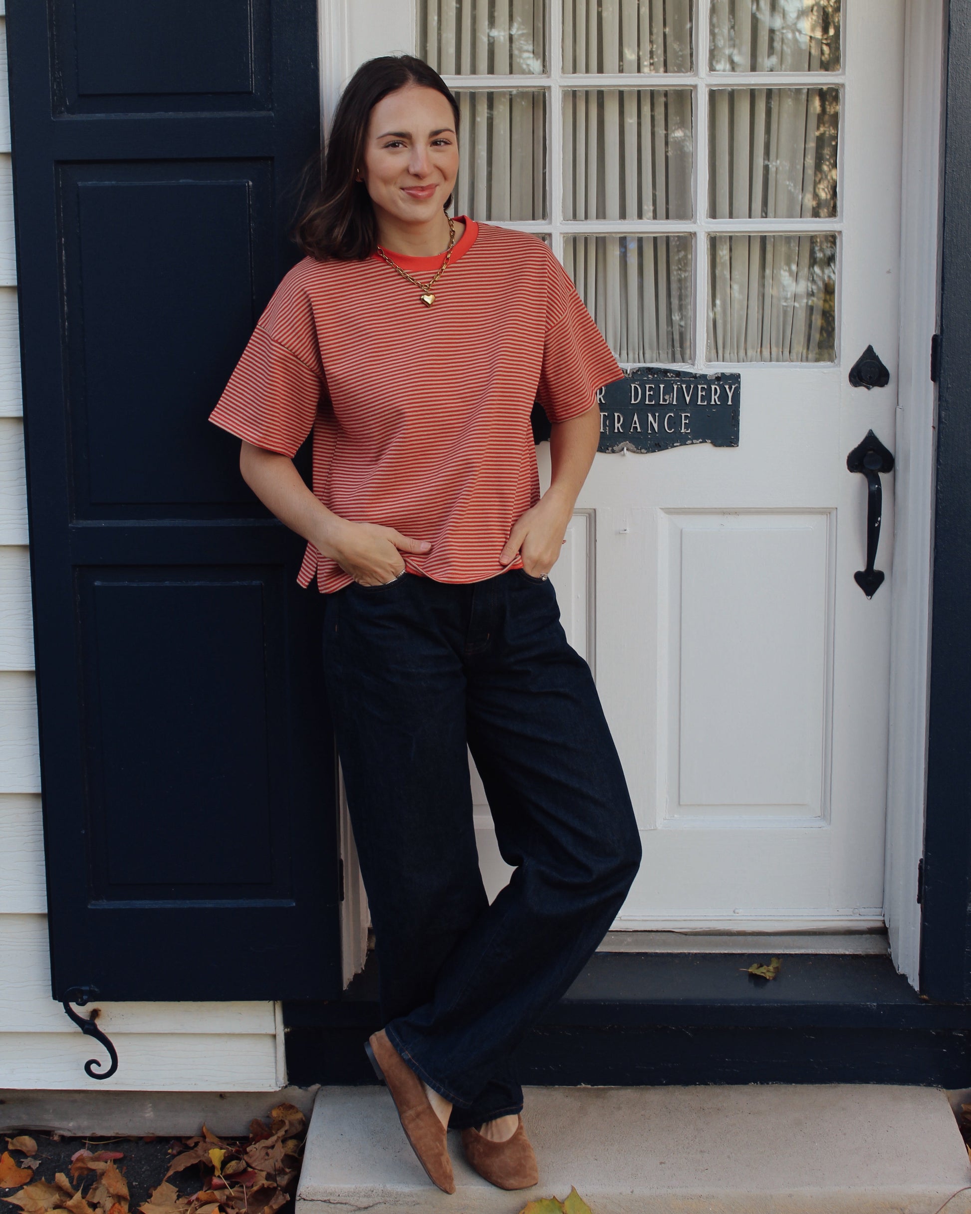 Get ready to sleigh in style with our Candy Cane Lane Tshirt! This boxy tee is perfect for the holiday season with its playful red and white stripe. A must-have basic that will add some deliciously festive vibes to your wardrobe.