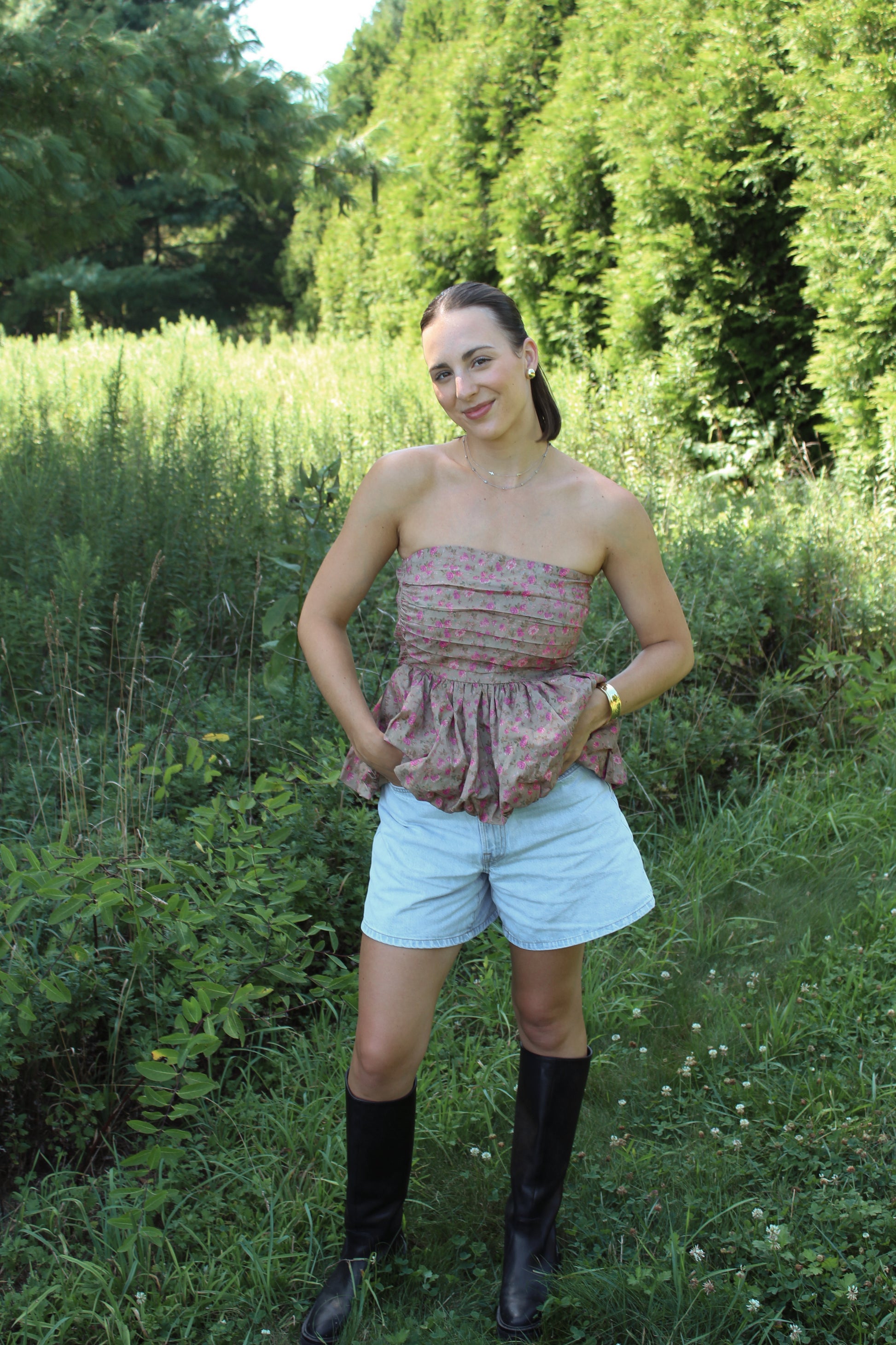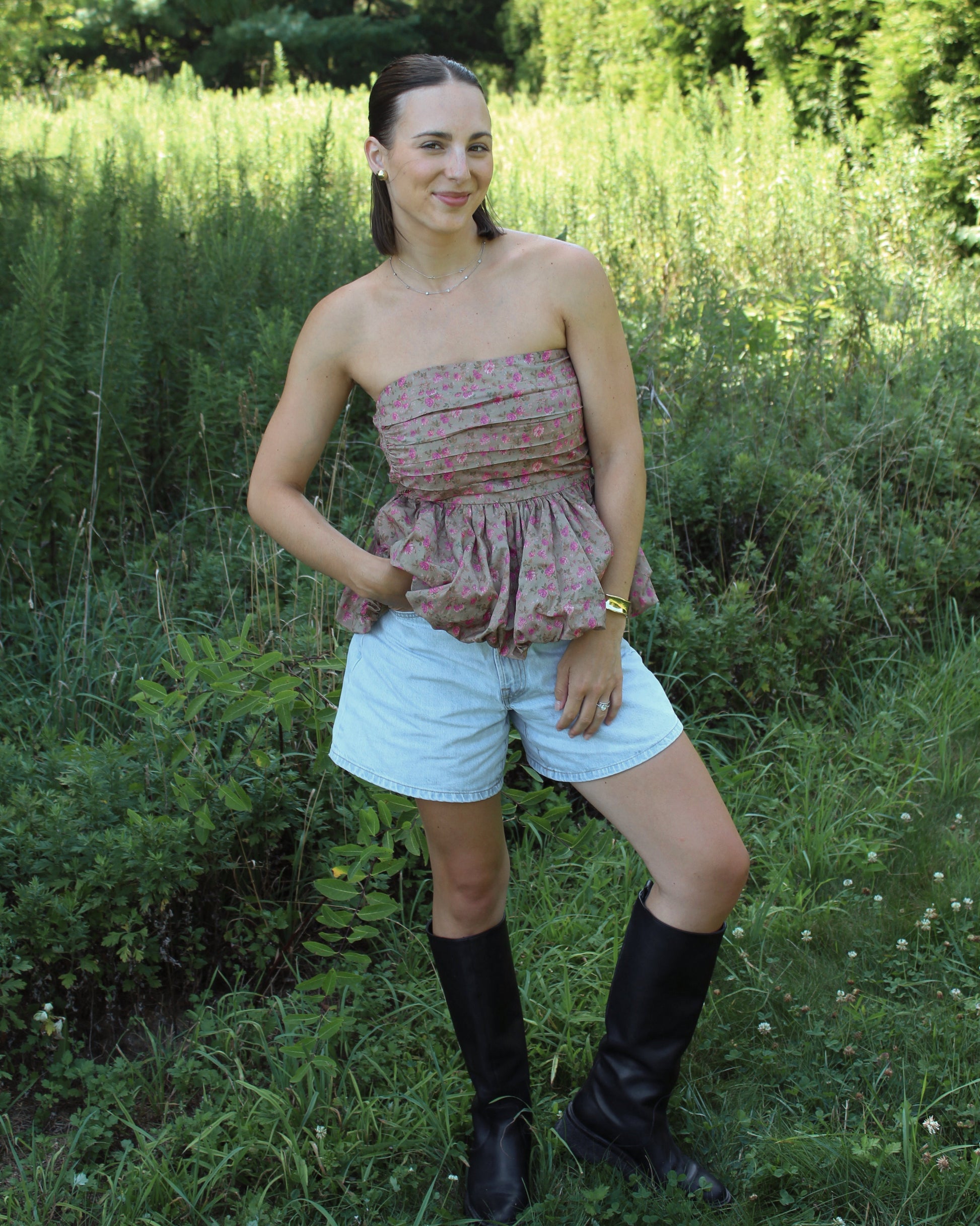 The Margot Floral Bubble Blouse features a strapless, bubble silhouette that effortlessly blends flirty charm with feminine elegance. Its transitional color palette gracefully shifts from summer brightness to fall warmth, making it a versatile piece for your wardrobe. Perfect for layering or wearing on its own, this blouse adds a playful yet sophisticated touch to any outfit. Same fit as our Paige Blouse!